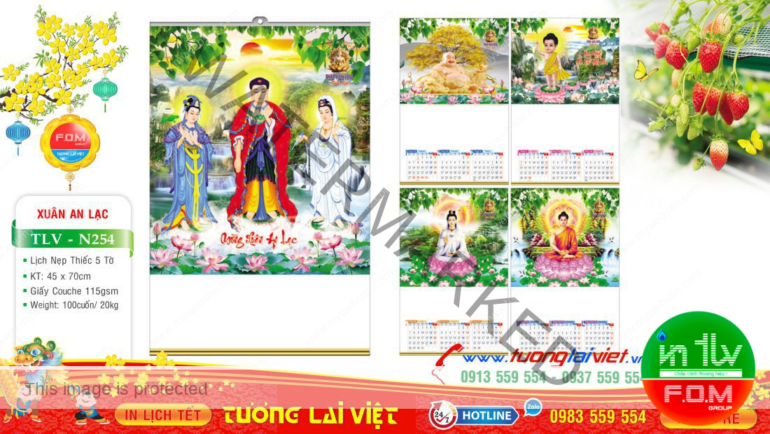 Lịch 5 tờ nẹp thiếc thường được in Offset 1 mặt trên giấy C105gsm, có kích thước: 36×70 và 45x70cm. Lịch 5 tờ Lịch phật giáo là mẫu lịch tờ treo tường giá rẻ nên được nhiều cửa hàng nhỏ lẻ chọn in lịch tết năm nay để làm quà tặng cuối năm cho khách hàng, bạn bè, đối tác và người thân nhân dịp năm mới.